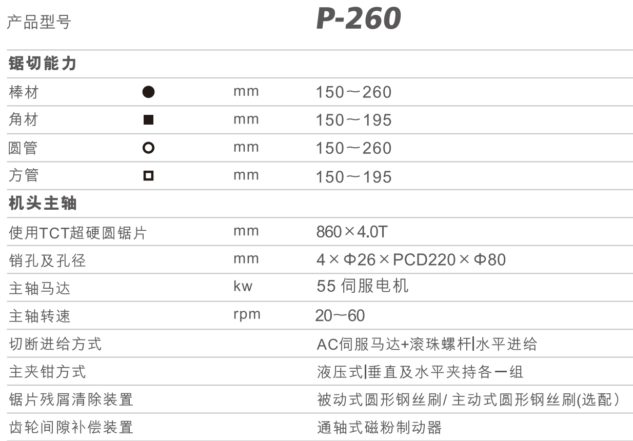• CNC數(shù)控P-260型高速圓鋸機 CNC數(shù)控P-260型高速圓鋸機詳細(xì)參數(shù):